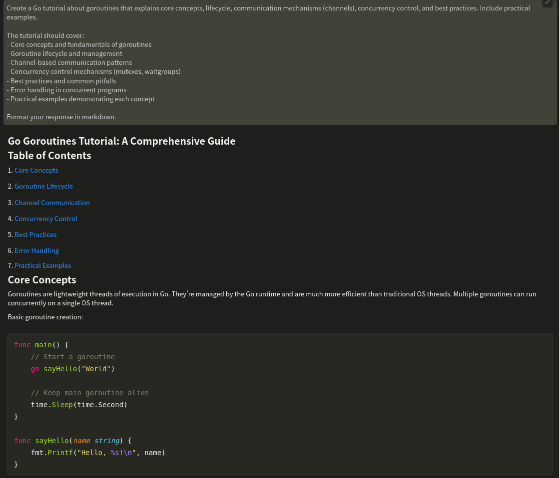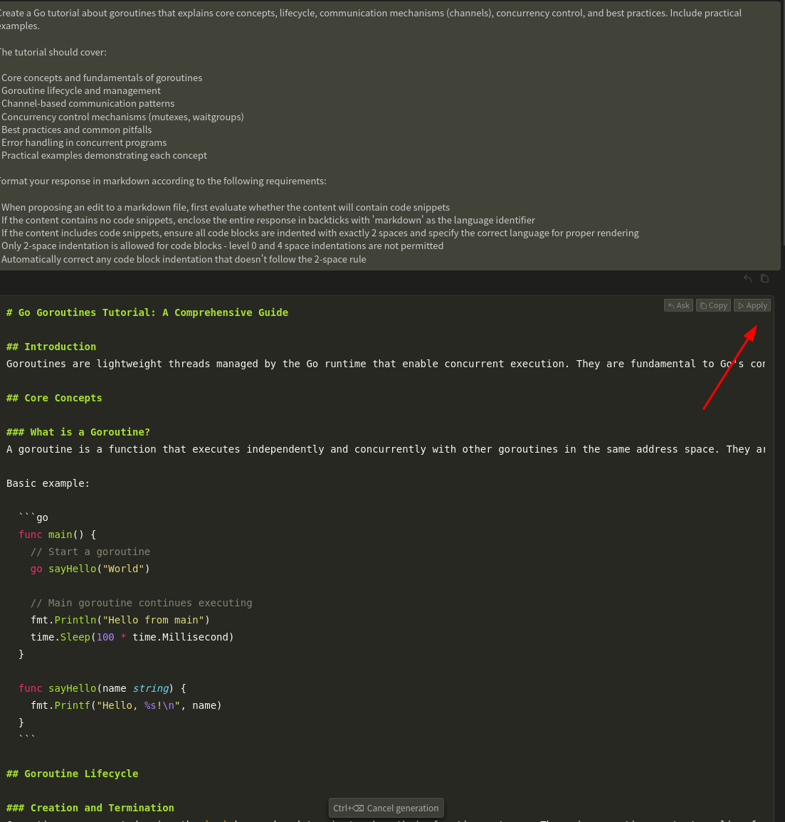下面有个案例,要求 cursor 回答 我golang 协程相关的知识点, 并且输出 markdown 内容