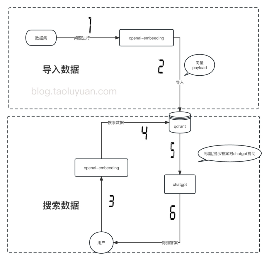 - 用户进行问题搜索,通过 openai embedding 得到向量,从 qdrant 中搜索相似度大于0.8的数据